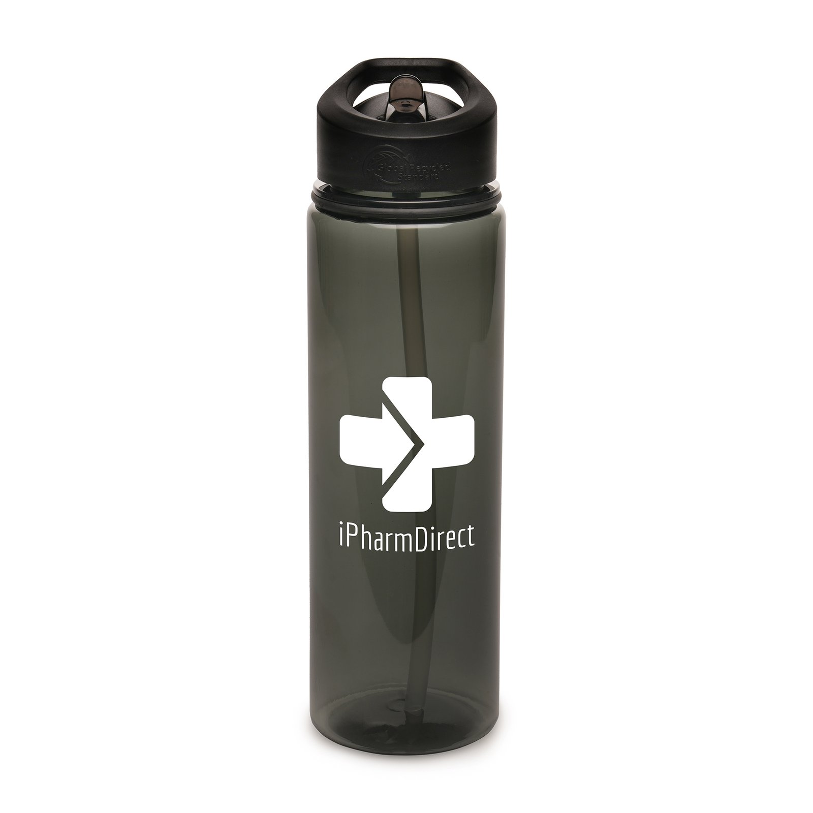 725ml single walled, coloured, RPET drinks bottle with PS fold down sipper, RPE straw, coloured band and PP coloured plastic screw on lid with built-in handle. BPA and PVC free.