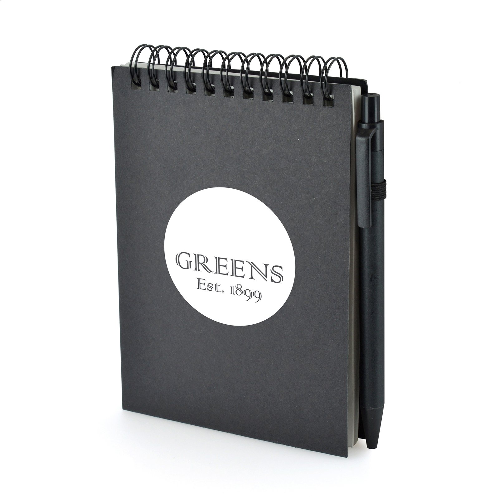 A6 Recycled wiro bound flip over 60 sheet jotter with pen. Pen can be personalised and is supplied with black ink.