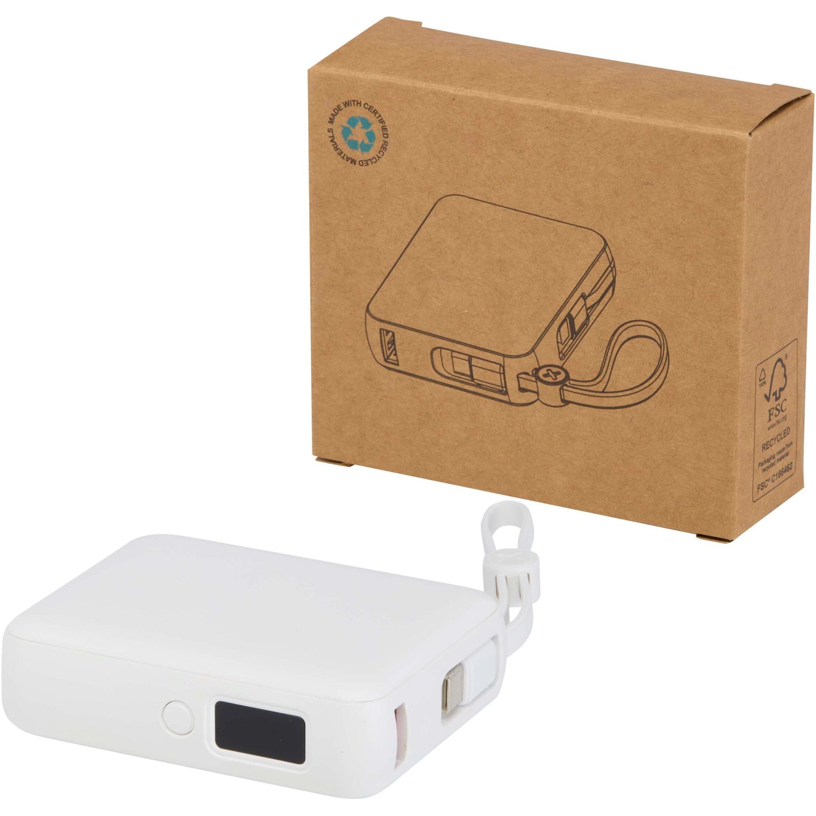 The Acrux 10.000 mAh power bank is made from recycled plastic and is designed for fast, convenient charging wherever you are. It features a 35W USB-C in/out port and an 18W USB-A port, along with a built-in USB-C and Lightning cable, so you can charge your devices without needing extra accessories. A digital display shows the charging percentage at a glance, making it easy to monitor battery levels. Perfect for keeping smartphones and tablets powered throughout the day.