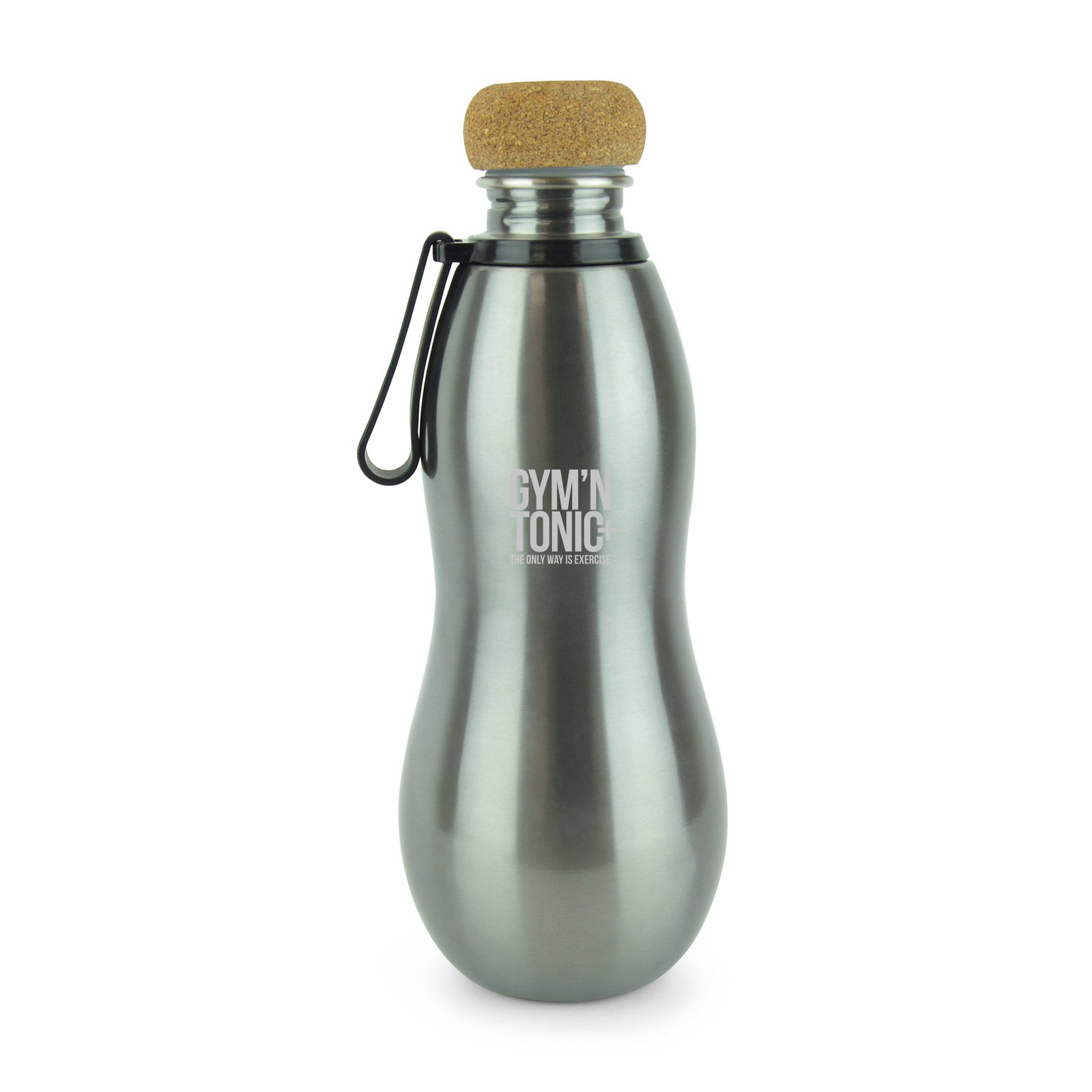 690ml single walled stainless steel bottle with PP plastic and cork screw on lid. Hourglass curve design for easy grip with black plastic and silicone carry strap attachment. BPA & PVC free.
