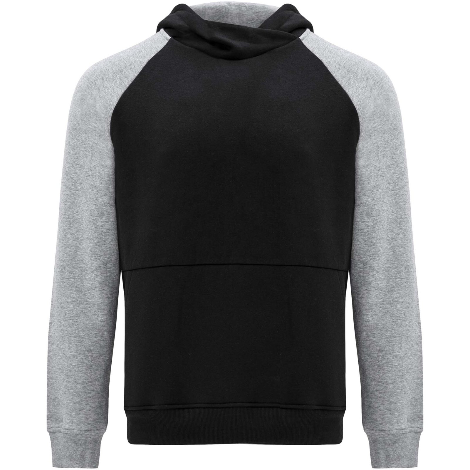 Two-colour unisex hoodie. Hood with crossed neck and metal eyelets. Contrasting inner hood, drawcord and raglan sleeves. Kangaroo pocket. Cuffs and hem in 1×1 elastane rib knit. Removable label.