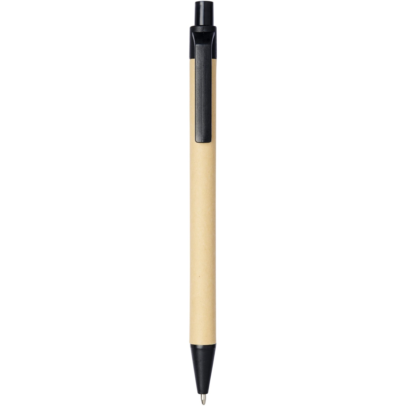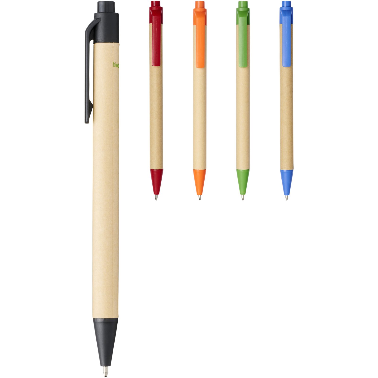 Eco friendly ballpoint pen with click action mechanism, with a barrel made of biodegradable paper material, and corn plastic trims that comes in a variety of colours. Recycled carton colour may vary.