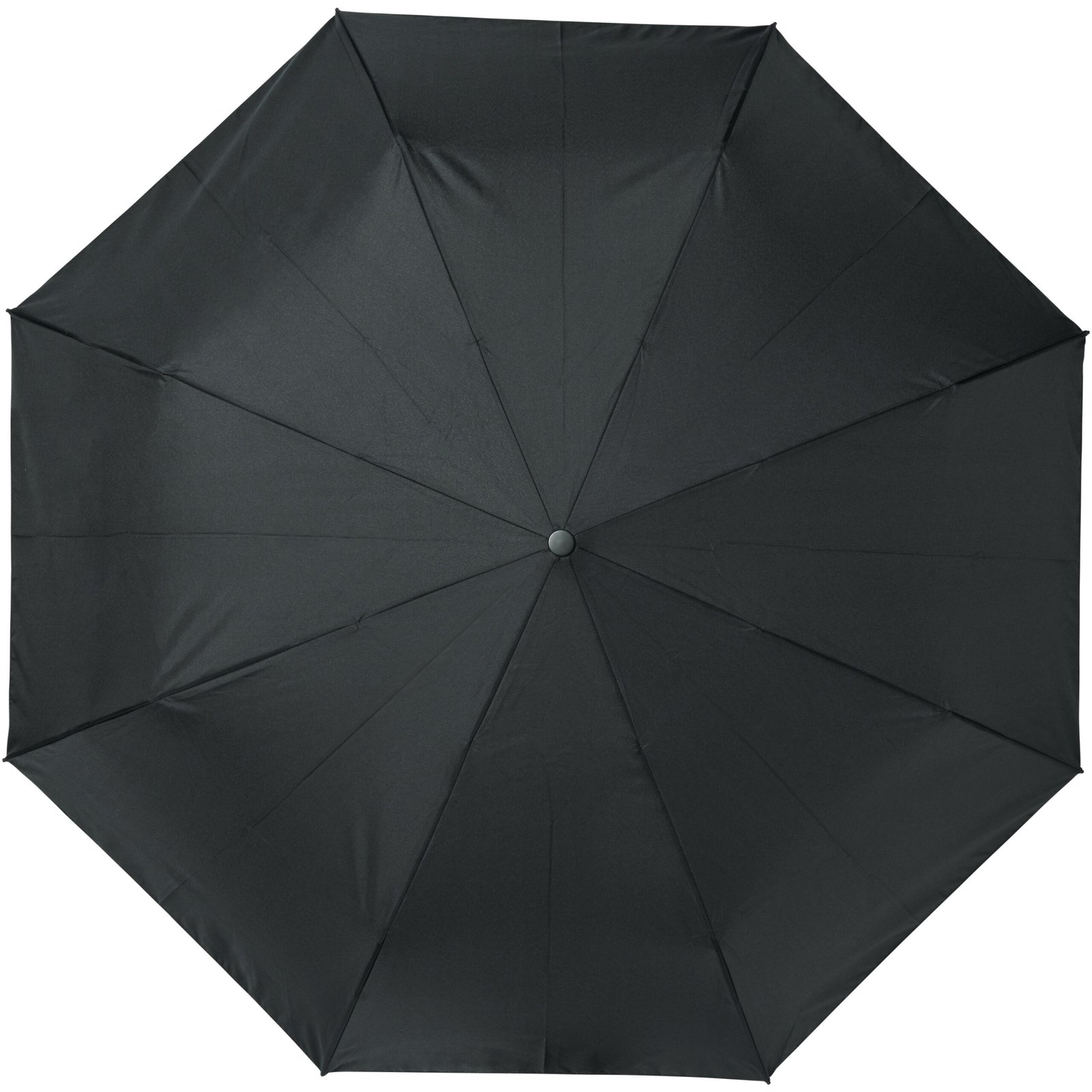 Automatic open and close folding umbrella with a recycled PET pongee polyester canopy. Sturdy metal shaft, a high quality frame with fibreglass ribs offering maximum flexibility in windy conditions. Supplied with a pouch and can easily fit a handbag or backpack for convenient carrying. Together with the wooden handle and the recycled PET pongee polyester canopy it offers a more responsible choice. Available in an wide variety of contemporary colours with a large decoration area on each of the panels.