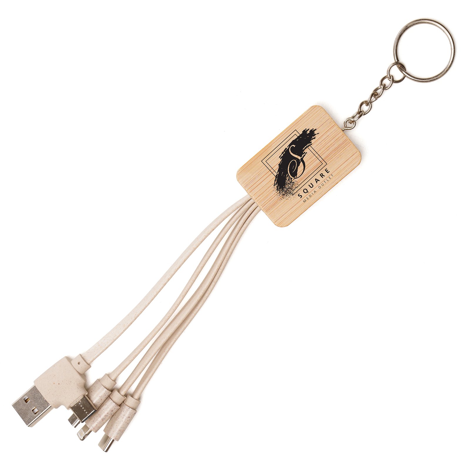 10W round or rectangular bamboo charger keyring with split ring attachment. Features wheat straw plastic cables with dual USB-A/USB-C power adaptors and 8-pin lightening, micro USB and USB-C adaptors.