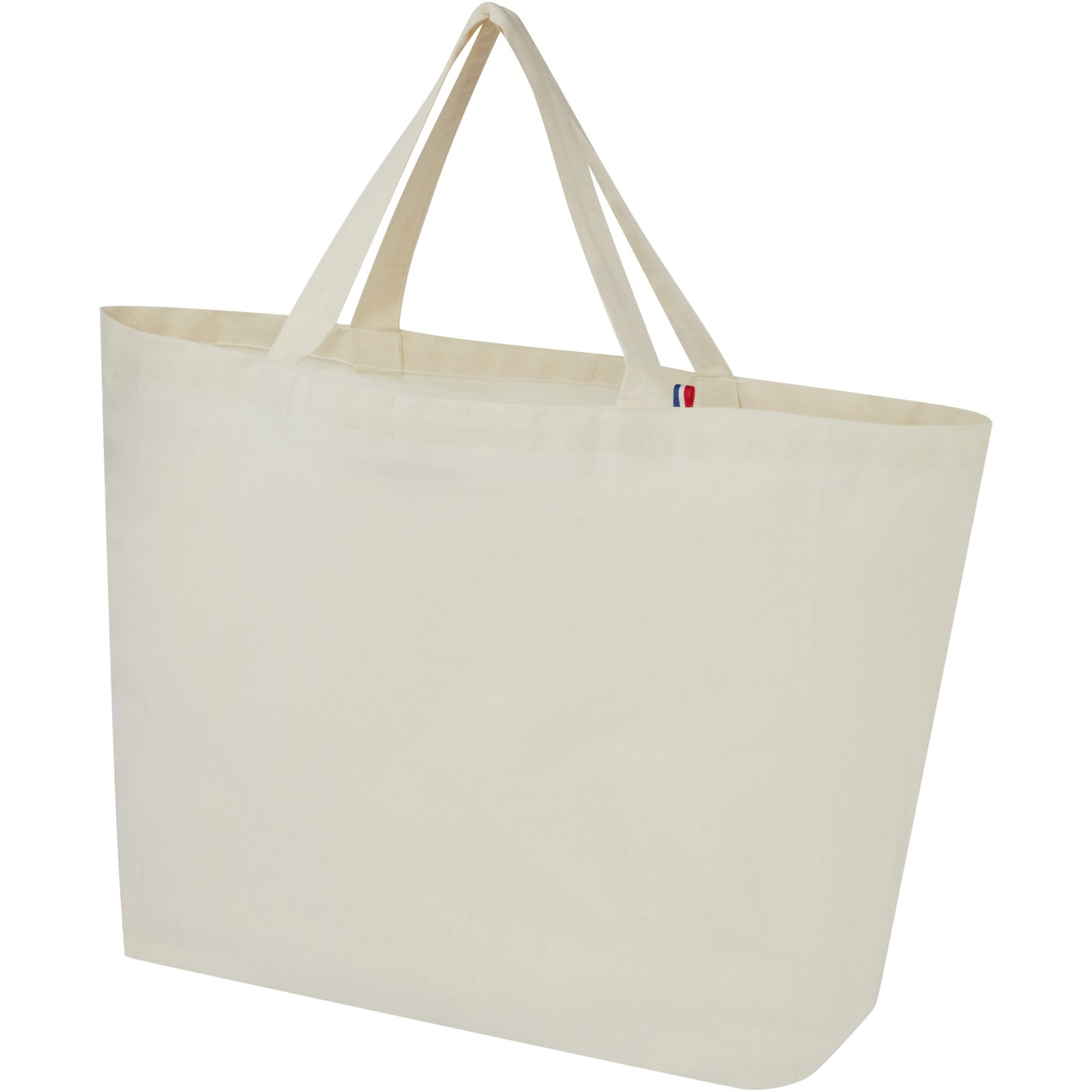 This large capacity tote bag is made with the finest, 100% recycled materials. It is constructed to use in everyday life, and suitable to carry around heavy books or groceries. The 200 g/m² recycled cotton/polyester blend ensures durability and reliability, giving the bag a resistance of up to 14kg weight. The yarns originate in Asia, but the weaving, spinning and manufacturing is all done in France.