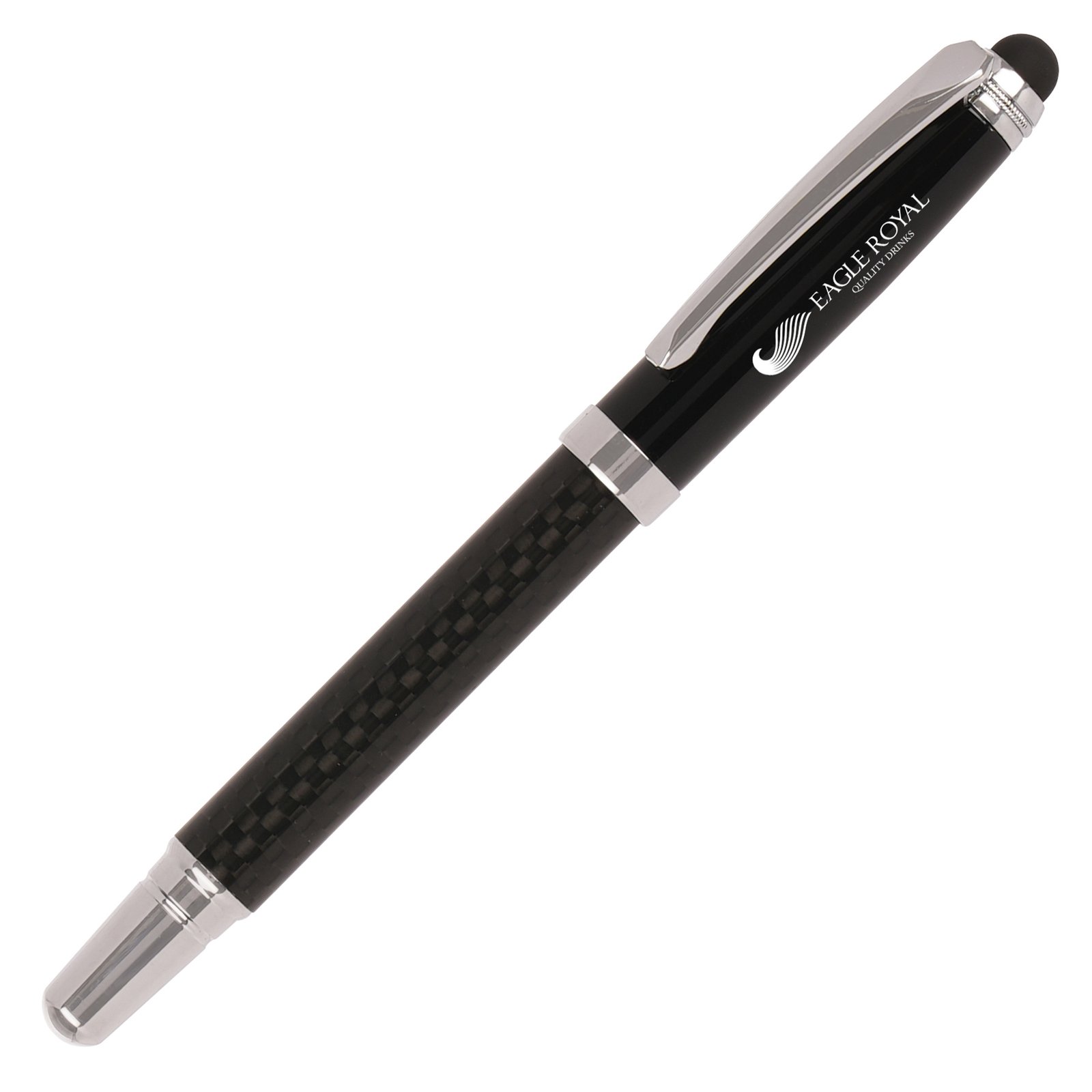 A high quality rollerball pen with a high grade carbon fibre barrel. Features a stylus that is perfect for using on touch screen devices. The barrel can be printed, whilst the cap can be engraved to show a mirror-chrome finish