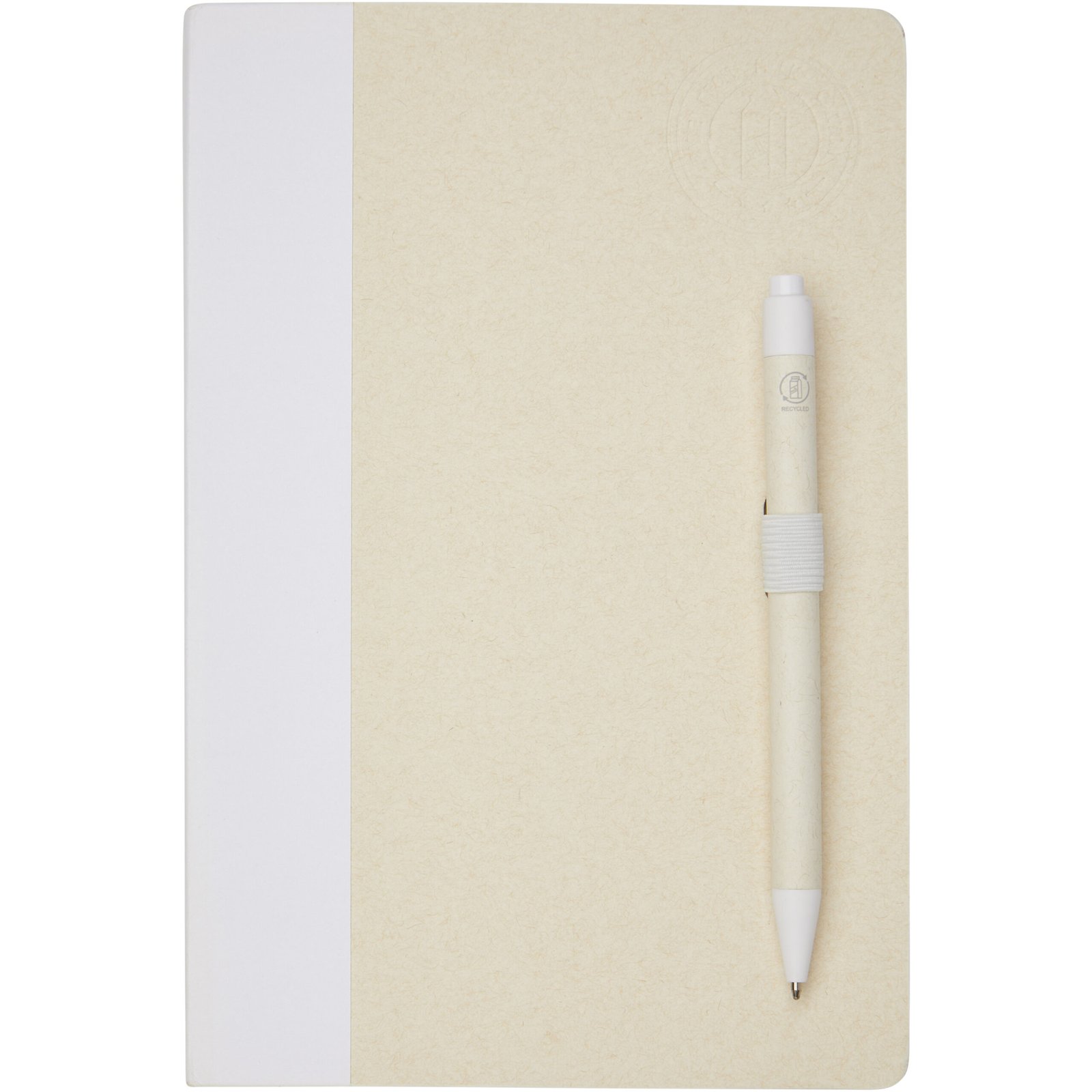 A5 size reference notebook and ballpoint pen set. The notebook features 80 lined sheets (80 g/m²) made from recycled milk cartons (up to 70%), a coloured paper spinal, and a pen loop. In the pen loop, there is a click-action ballpoint pen in matching colour of the notebook. The pen has a barrel made of the same recycled milk carton material and the button, clip, and tip is made of coloured PLA plastic. The pen features a black refill inside. Used milk cartons are collected, sorted, processed, and turned into paper, truly turning waste into something useful.