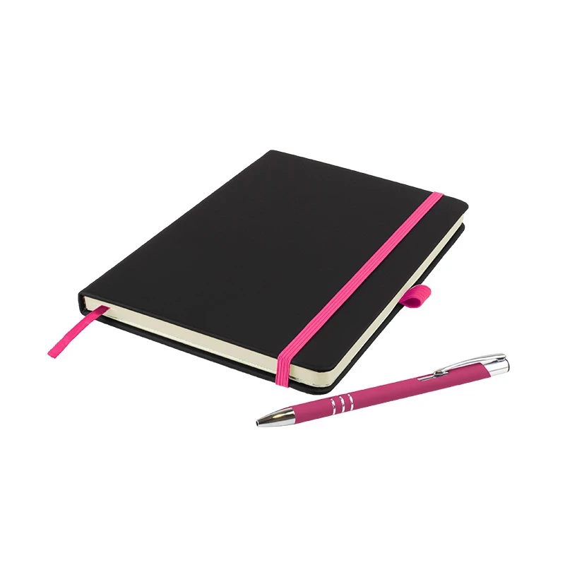 Distinctive A5 hardback notebook with a deep, soft-feel, PU cover in black. Complete with matching DaVinci ballpen, contrasting ribbon, pen loop and elastic closure giving a splash of colour. Contains 192 Ivory lined pages with date marks and inside back cover pocket.