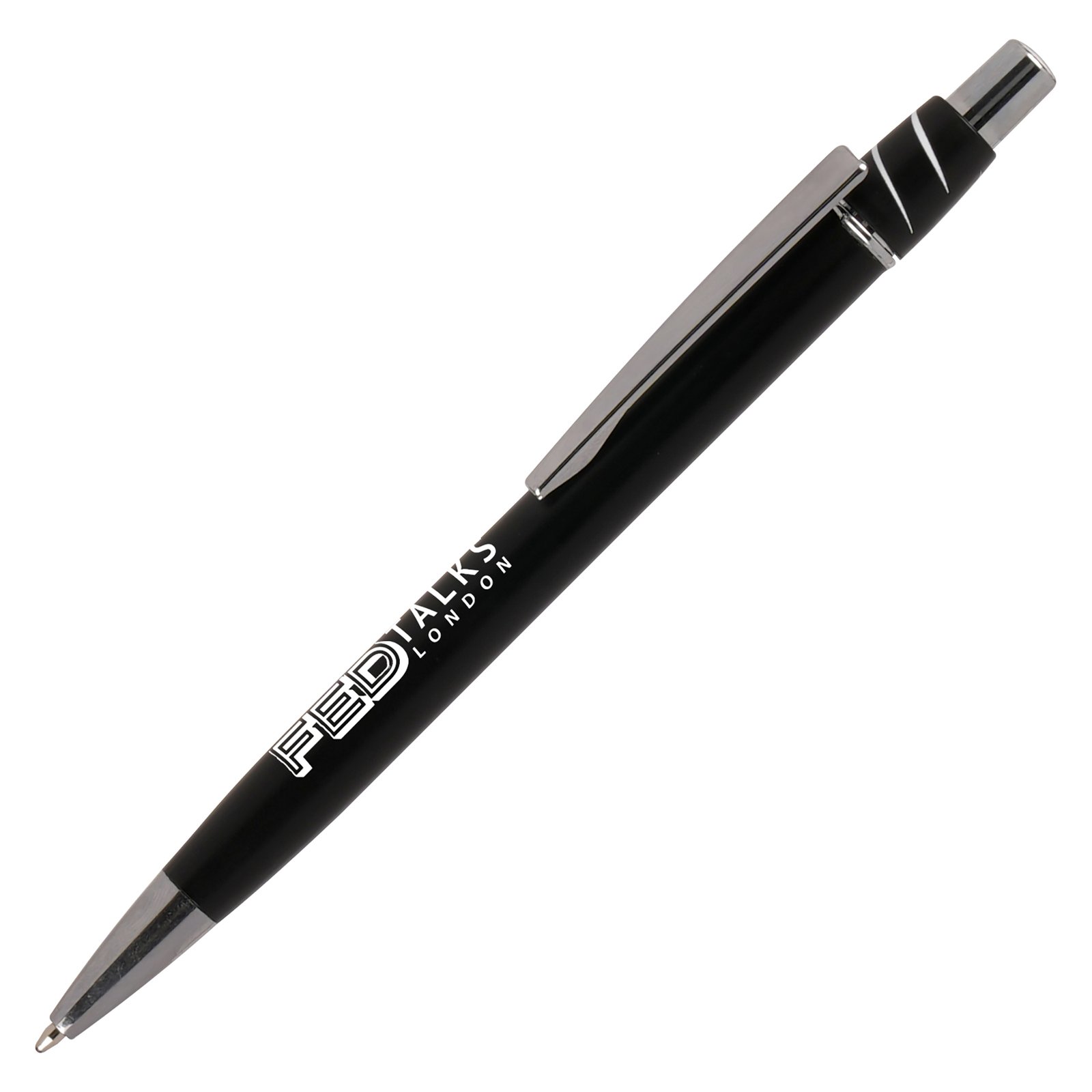 Aluminium push action ball pen featuring a 360 degree spinner on top to aid concentration and reduce anxiety. This pen is not only practical but also soothing for moments of stress.