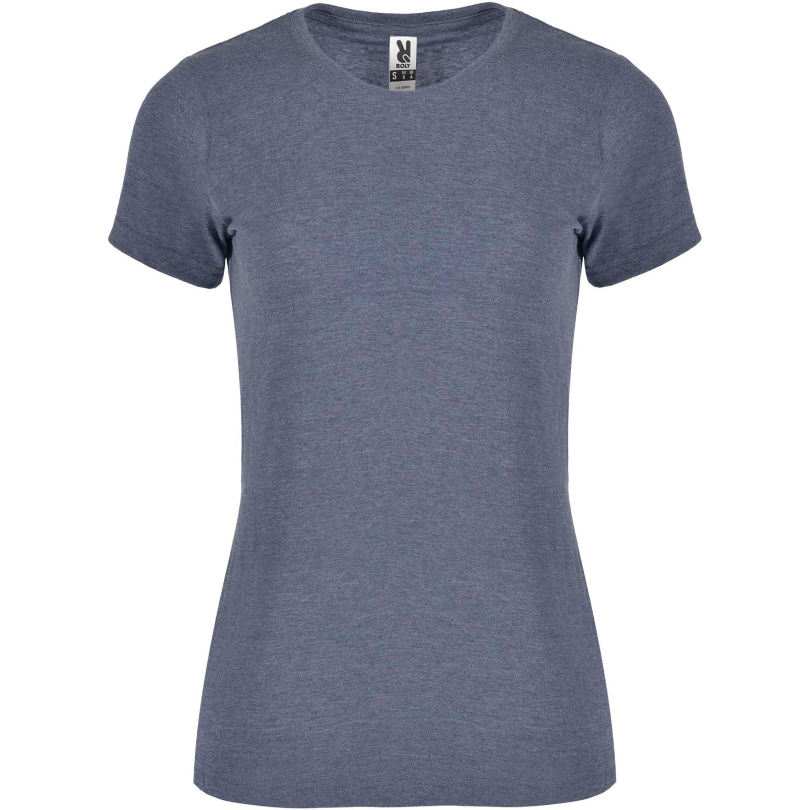 Short-sleeve t-shirt with heathered effect. Fitted design. 1×1 ribbed crew neck with interior reinforced covered seams. Tubular fabric. Removable label.