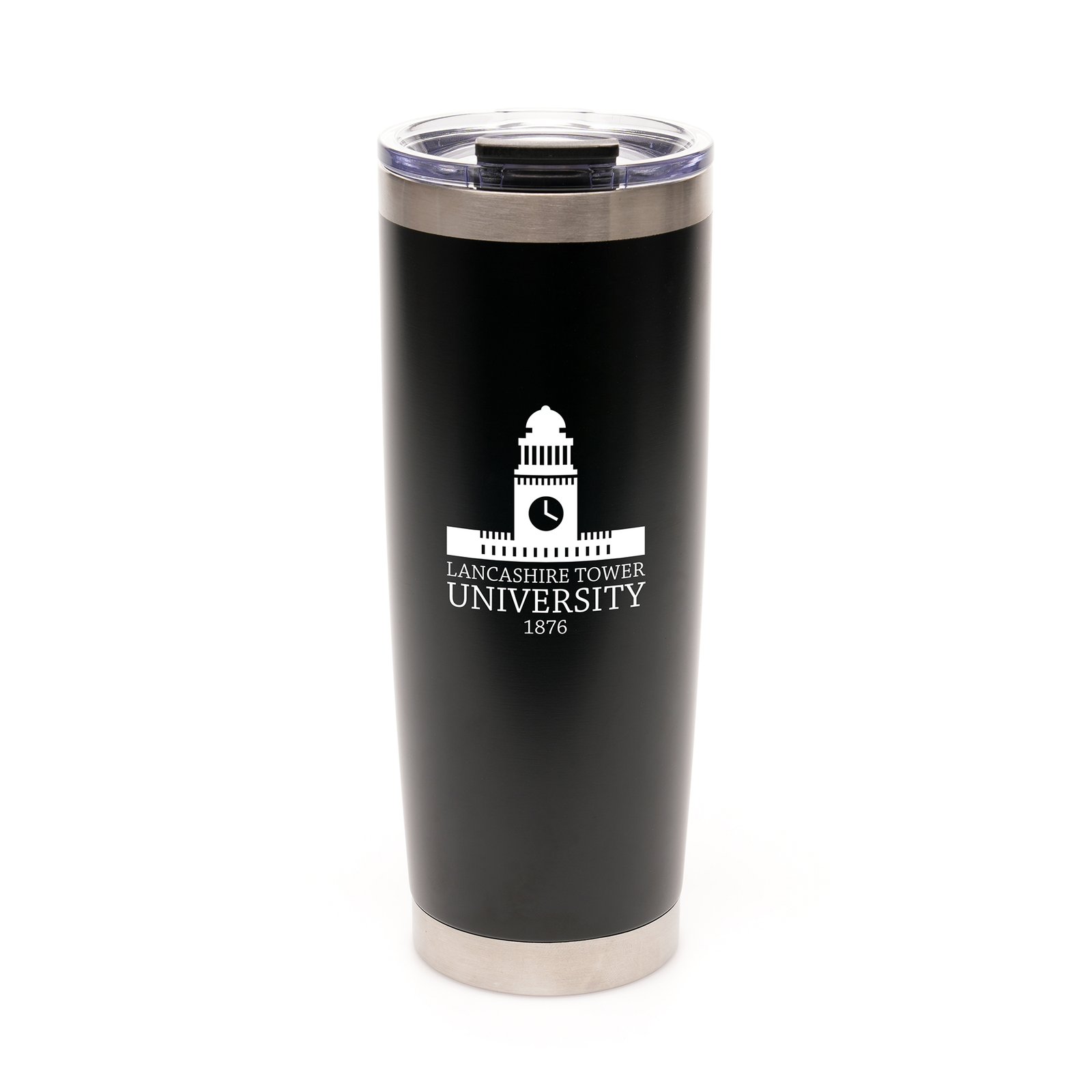 600ml double walled stainless steel tumbler with a clear screw on lid (AS plastic) with a black flip-up rubber stopper and drinking spout (PR plastic and TPR). Silver stainless steel accent to the top and bottom of the bottle. BPA & PVC free,
