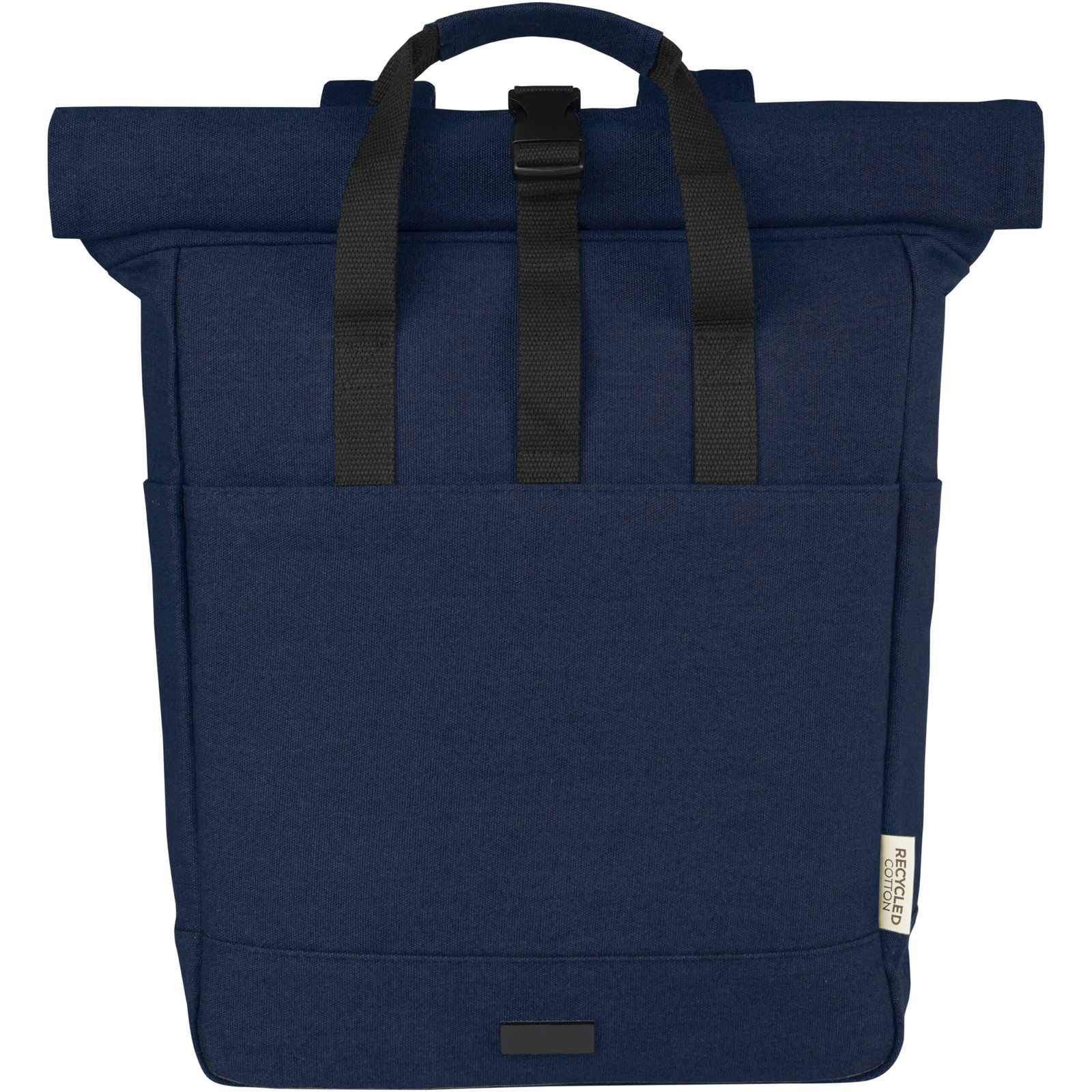 Composed with GRS recycled canvas and GRS RPET lining, the Joey retail-inspired rolltop backpack features a dedicated tablet sleeve along with a 15″ padded laptop compartment. The backpack also has 2 side water pockets and one zippered large front pocket, as well as a zippered rolltop opening for maximum storage and safety. The 2 reinforced webbing handles makes it easy and comfortable to carry around as a business tote bag. The decorative metal plate can make a logo shine through its subtle and matt finish.