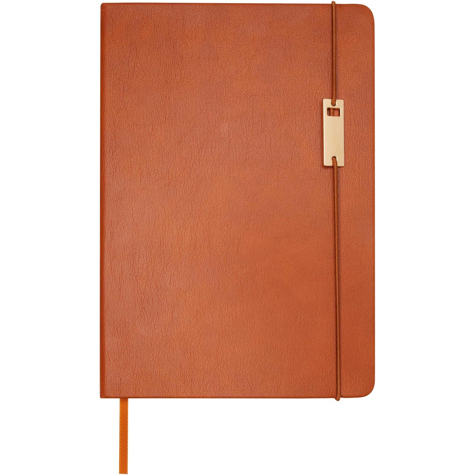 The Legato is an elegant combination of an A5 notebook and a rollerball pen. The pen has a recycled brass upper barrel with gold chromed finish, lower barrel with a black/brown spray coating finish, metal gold chromed accessories, and a LUXE logo on the mid ring. Ink colour: Blue. Writing length: 400 metres. Nib size: 0.7 mm. The notebook has 80 sheets of 80 g/m² lined paper, and has a recycled plastic cover, an elastic closure, ribbon marker, and accordion pocket. Gold chromed metal accessory on the elastic closure. Delivered in a recycled cardboard gift box.