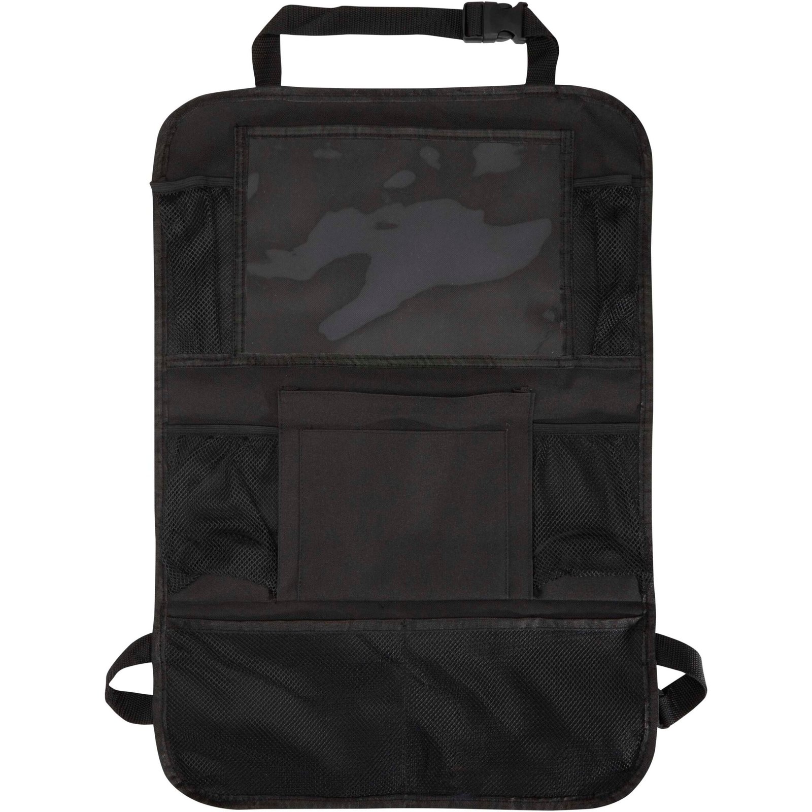 Car back seat organiser with multiple mesh pockets to hold essentials such as snacks, toys, or bottles, plus a PVC window for a tablet. It attaches easily to the front seat and helps keep your car tidy and clutter-free – ideal for families, road trips, or everyday use.