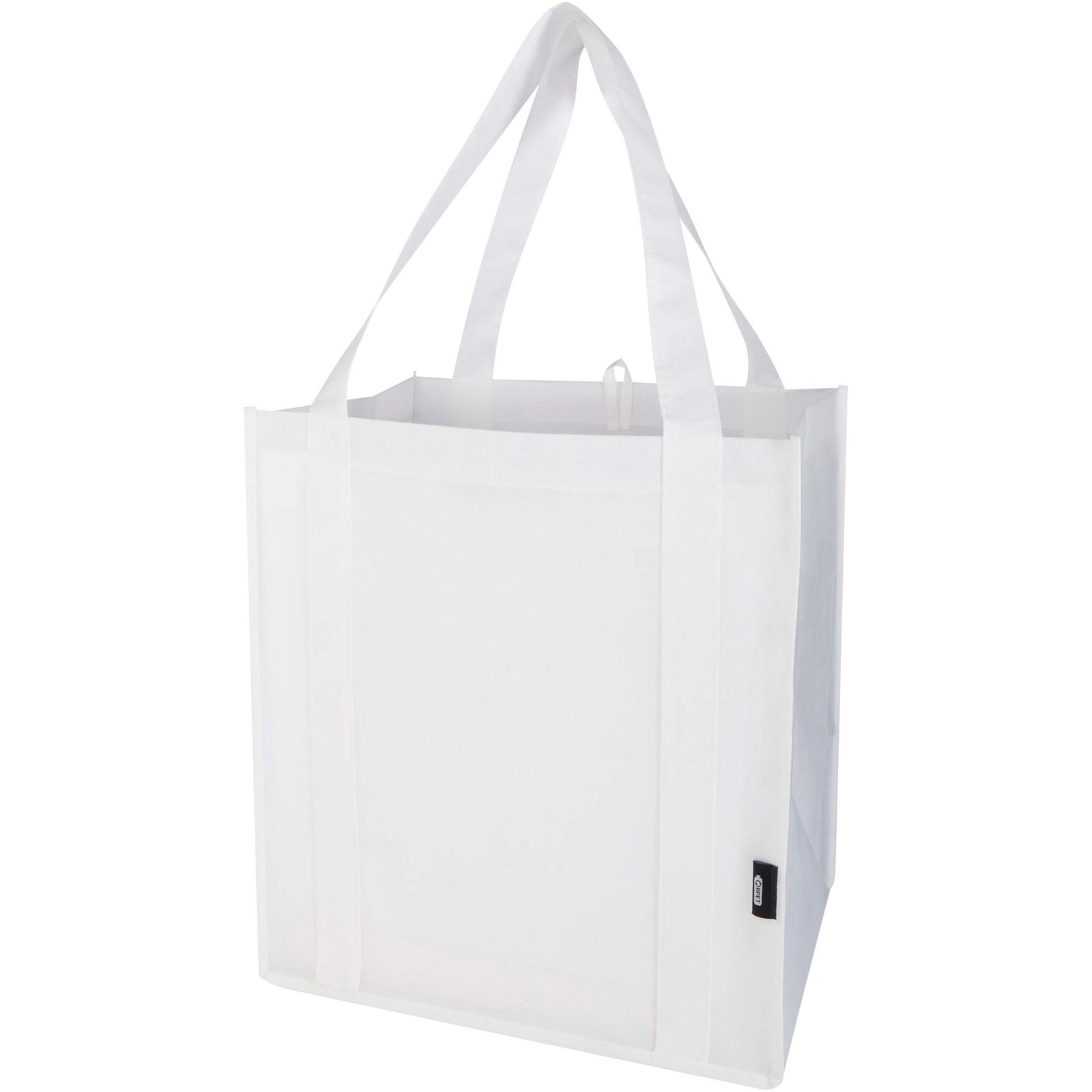 Made from durable and tear resistant non-woven RPET, the Liberty GRS certified recycled tote bag has a supportive bottom board, making it versatile and solid. The tote bag features a large main compartment and 25 cm long handles. Volume capacity: 29 litres. Resistance up to 12 kg weight.