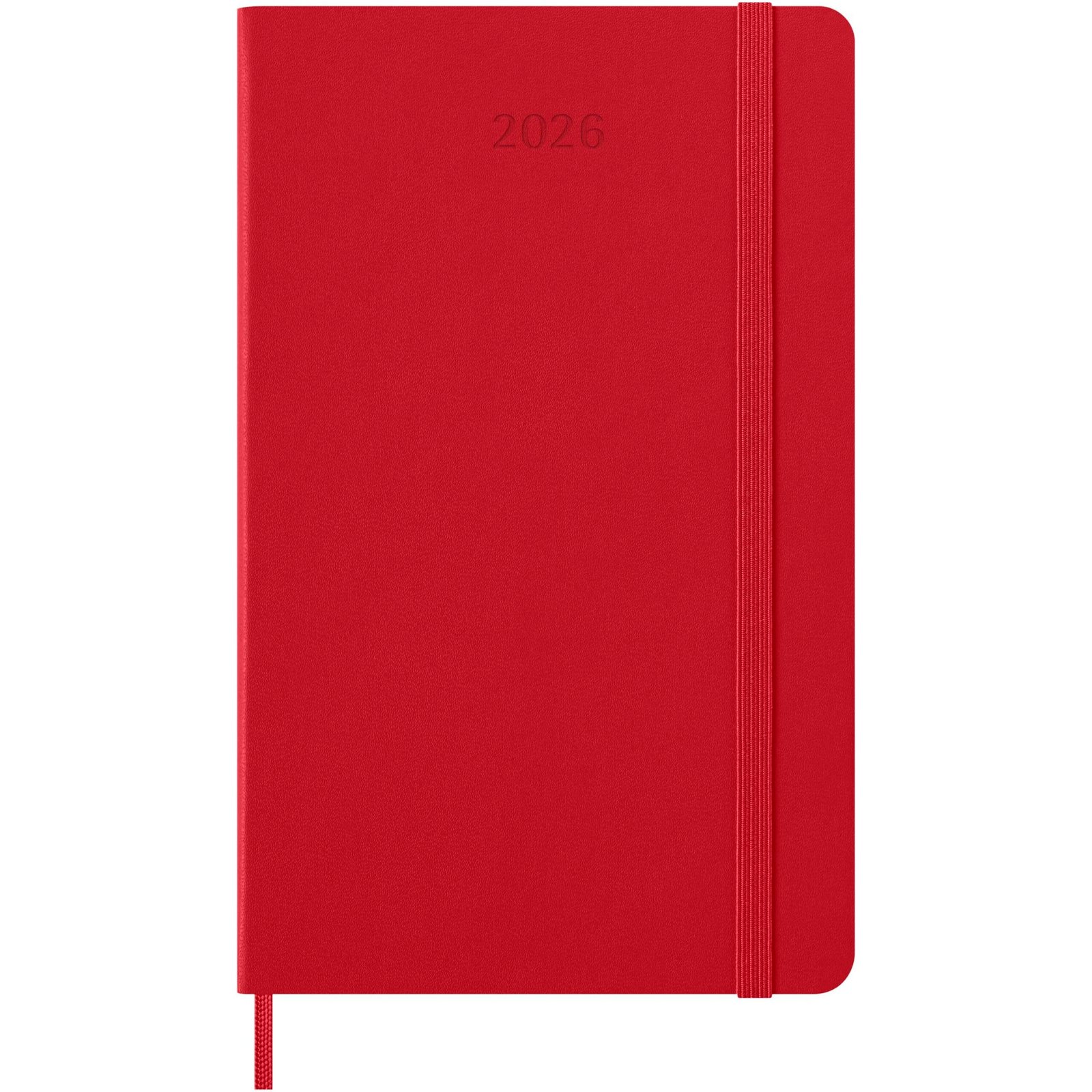 Dated from January to December 2026, the Moleskine hard cover 12-month weekly planner shows the whole week at a glance, while also providing yearly and monthly snapshot pages for a broader overview of the year, followed by pages for travel planning, ideas and goals. The days of each week are shown on one side opposite a ruled page for tasks and notes. Features ivory-coloured acid-free paper, a black elastic closure, a page ribbon marker, a colour coordinated expandable inner pocket, and stickers for personal customisation, as well as year stickers for the spine.