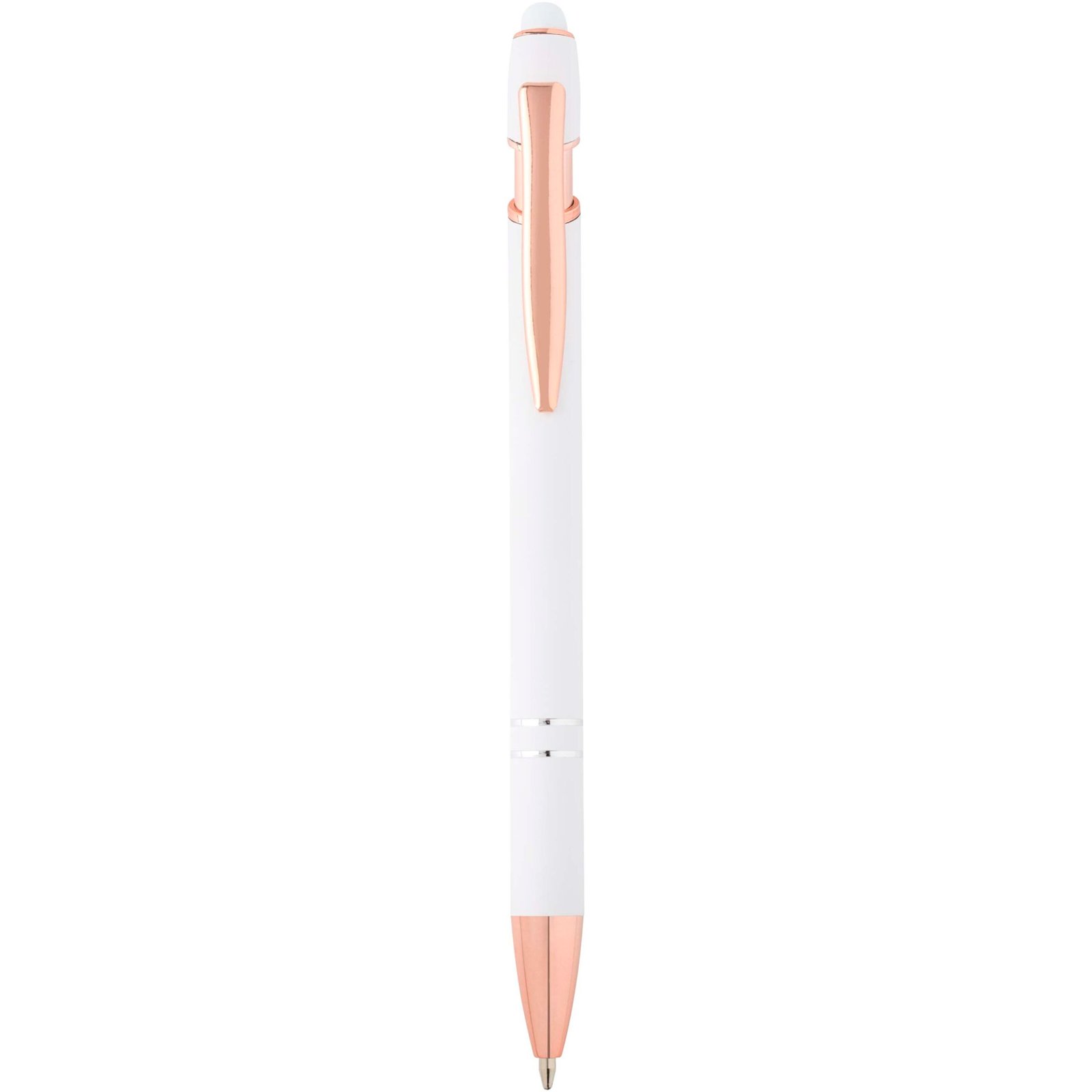 The Nanna ballpoint pen with rose gold finish has a barrel made of recycled aluminium with a touch stylus made of silicone. Recycled aluminium reduces the amount of waste in landfills and helps to conserve natural resources aiming to reduce greenhouse emissions. Ink colour: Blue. Writing length: 800 metres. Nib size: 1.0 mm.
