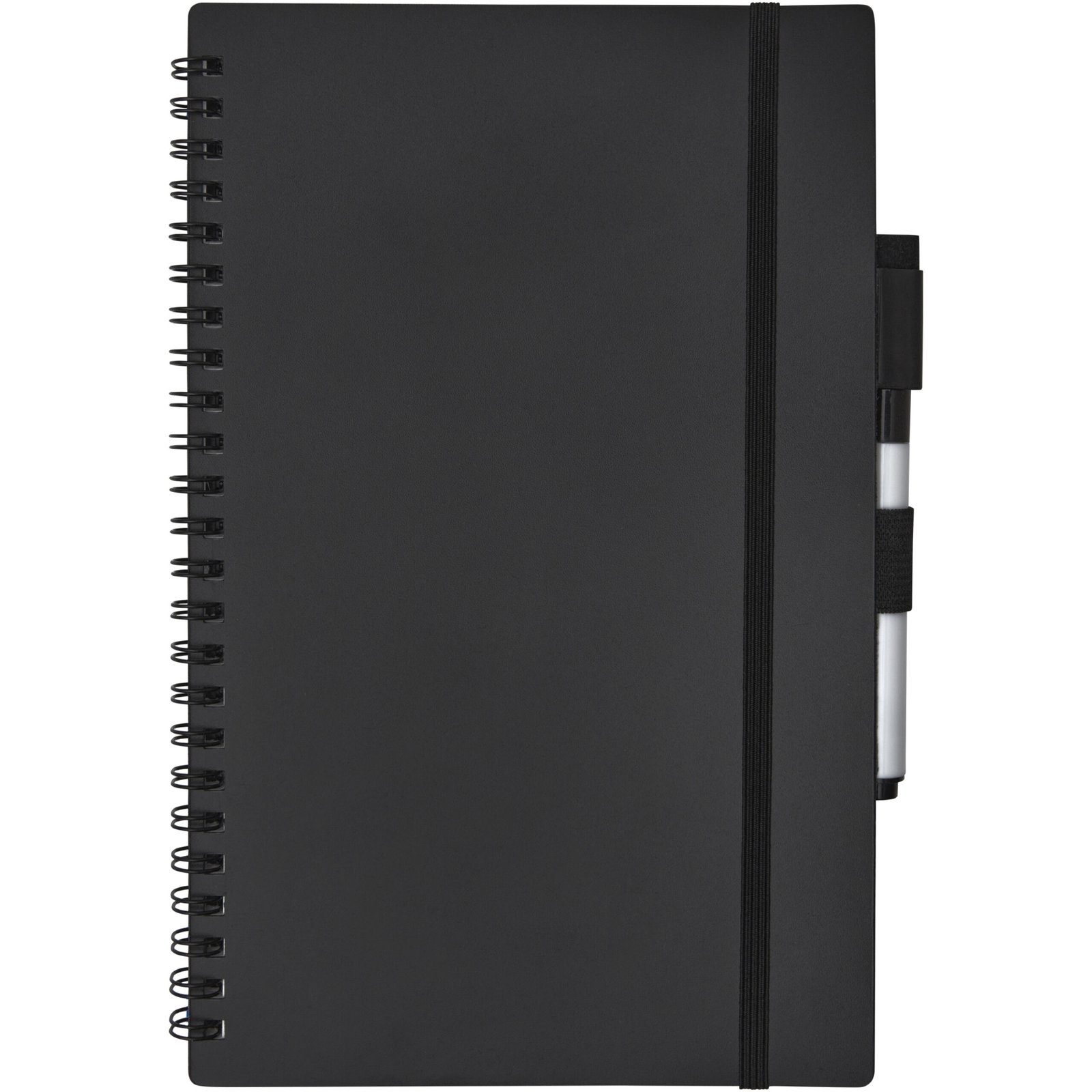 Sustainable notebook focused on reducing the use of paper to save the environment. After a while taking notes, drawing or brainstorming, the pages can be cleaned with the eraser on the marker to re-use the pages again. It can also be cleaned with a regular fabric cloth (not included). Features 20 sheets (40 pages) with half dotted and half blank layout, and a black writing marker.