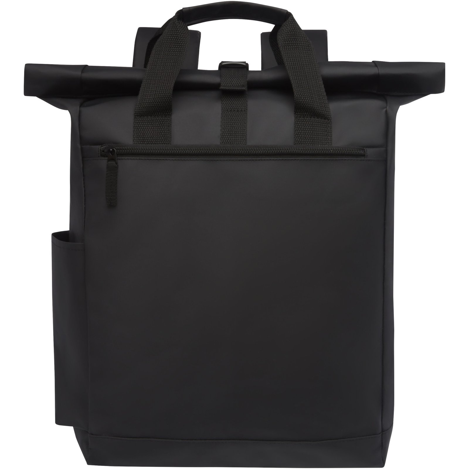 Water resistant backpack featuring padded laptop compartment, padded adjustable shoulder straps, zippered main compartment with roll top closure, and 2 carrying handles.