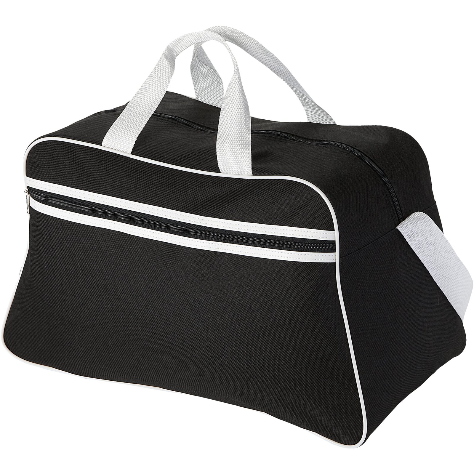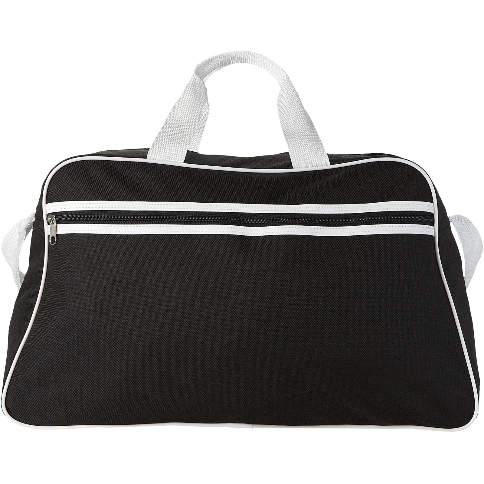 Sport bag with zippered main compartment and front pocket with zipper closure.