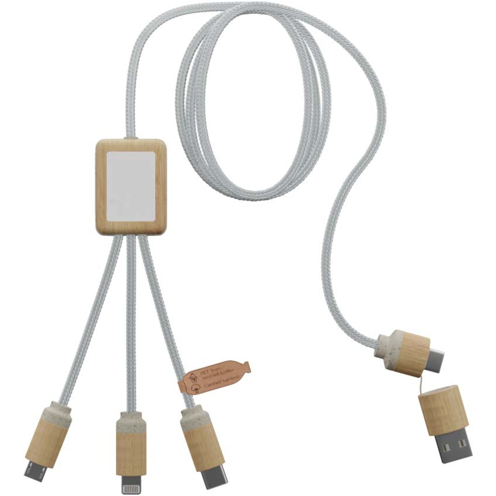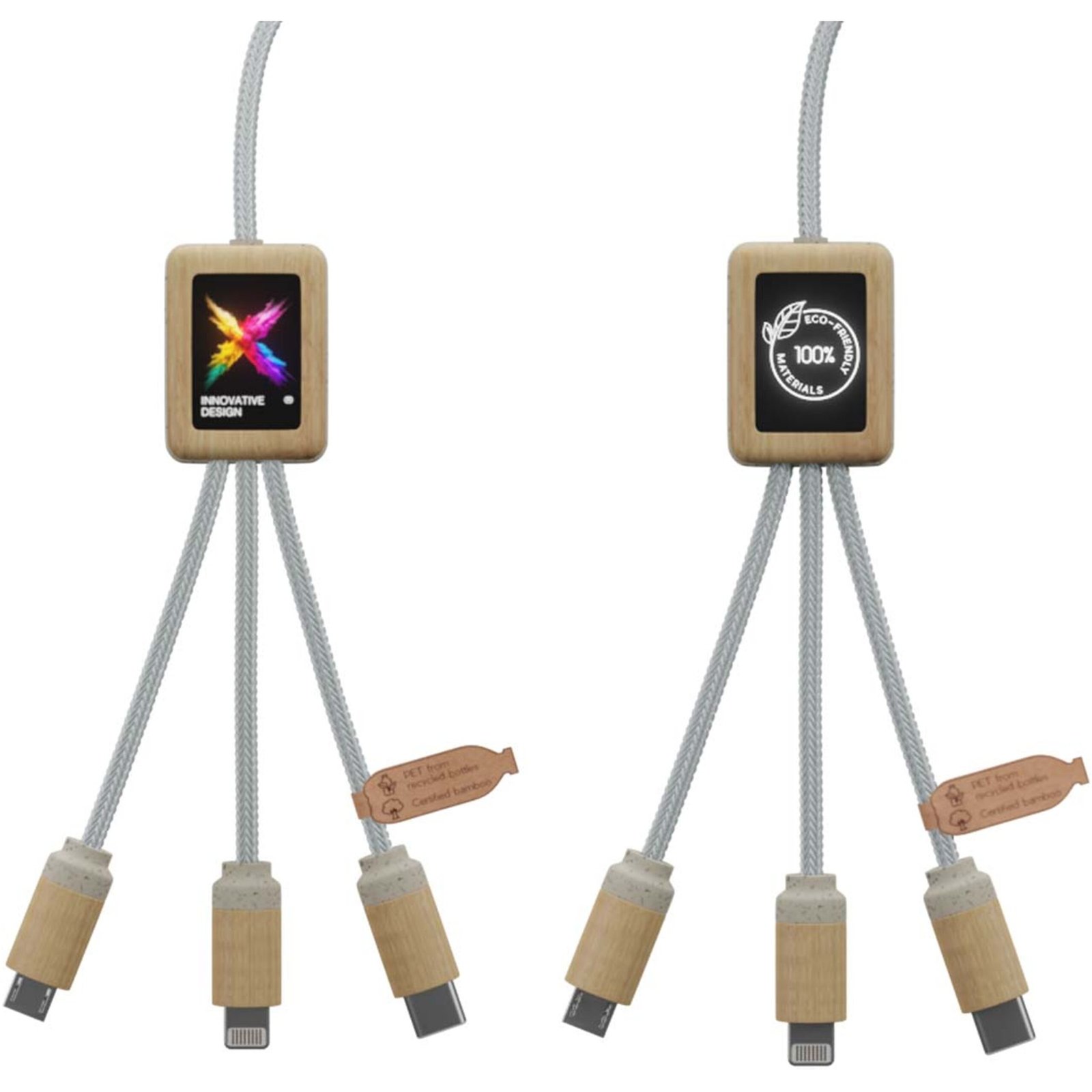 2.4A fast charging cable (3 x 10 cm) that can be customised with light-up logo on both sides, which also can be different from each other. This cable is entirely made with more sustainable materials: recycled PET cords, bamboo, wheat fibres and recycled plastic. The charging cable is made to be universal thanks to its 3 outputs (Type-C, Android, iPhone), and it can charge up to three devices simultaneously. Thanks to its double USB and USB-C input, this cable is compatible with the most recent chargers. Delivered in a cotton pouch (20 x 8 cm) with a kraft paper card.