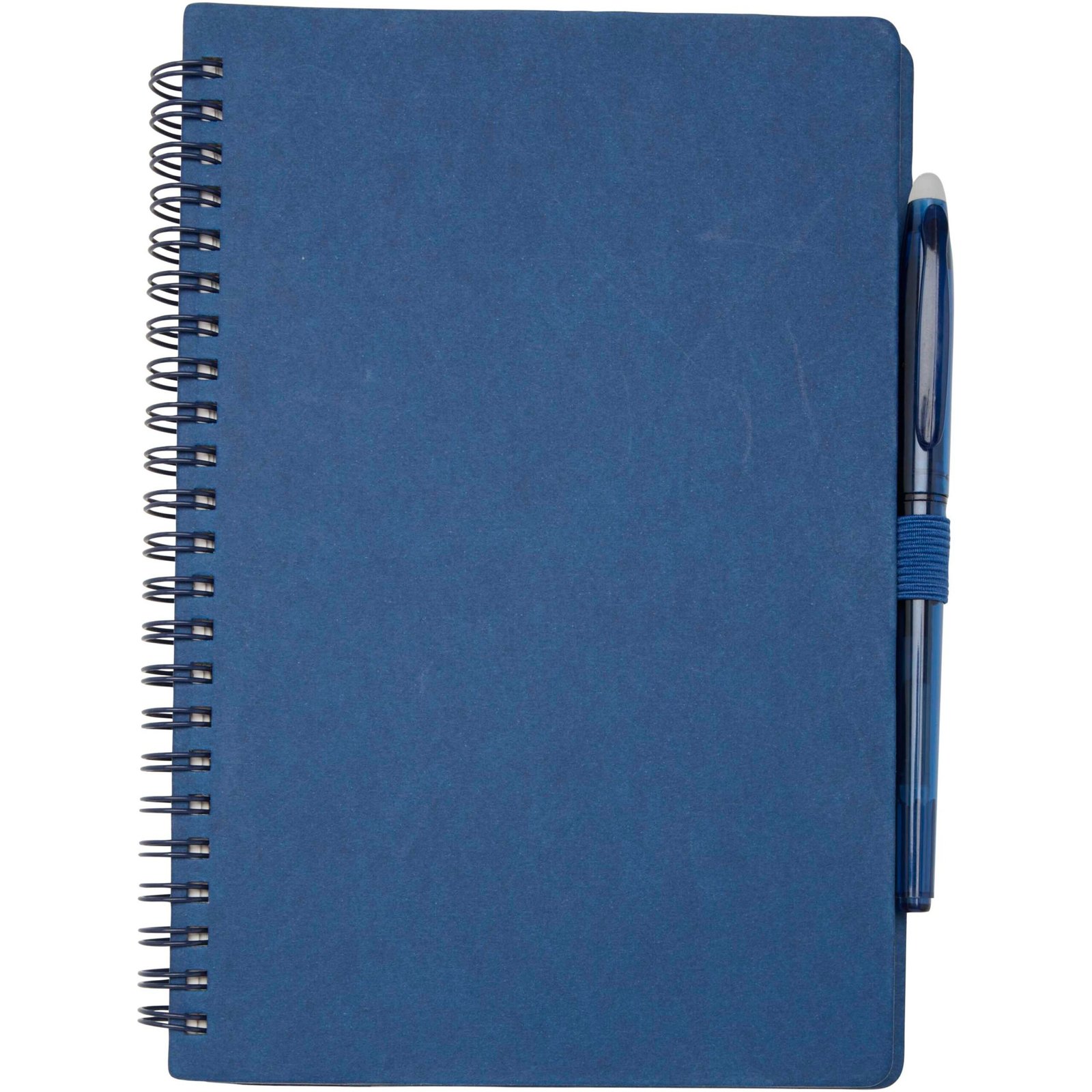 Reusable A5 stone paper hard cover notebook and pen set. The notebook has a cover made of cardboard, rounded corners, and 32 sheets of 120 g/m² lined paper. Stone paper is 100% tree-free and the production process uses less energy compared to recycled or new pulp paper. At the back there is a pocket to store a black wiping cloth (included). Erasable recycled plastic pen with a transparent barrel, white eraser on top, and a solid coloured grip. Ink colour: Black. Writing length: 250 metres. Nib size: 0.7 mm.