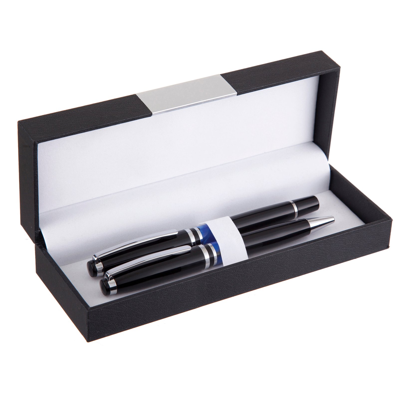 A traditionally styled prestigious gift box with hinged lid that is suitable for 1 or 2 pens. The lid includes a metal plate which is ideal for printing or engraving (price is for plain product).