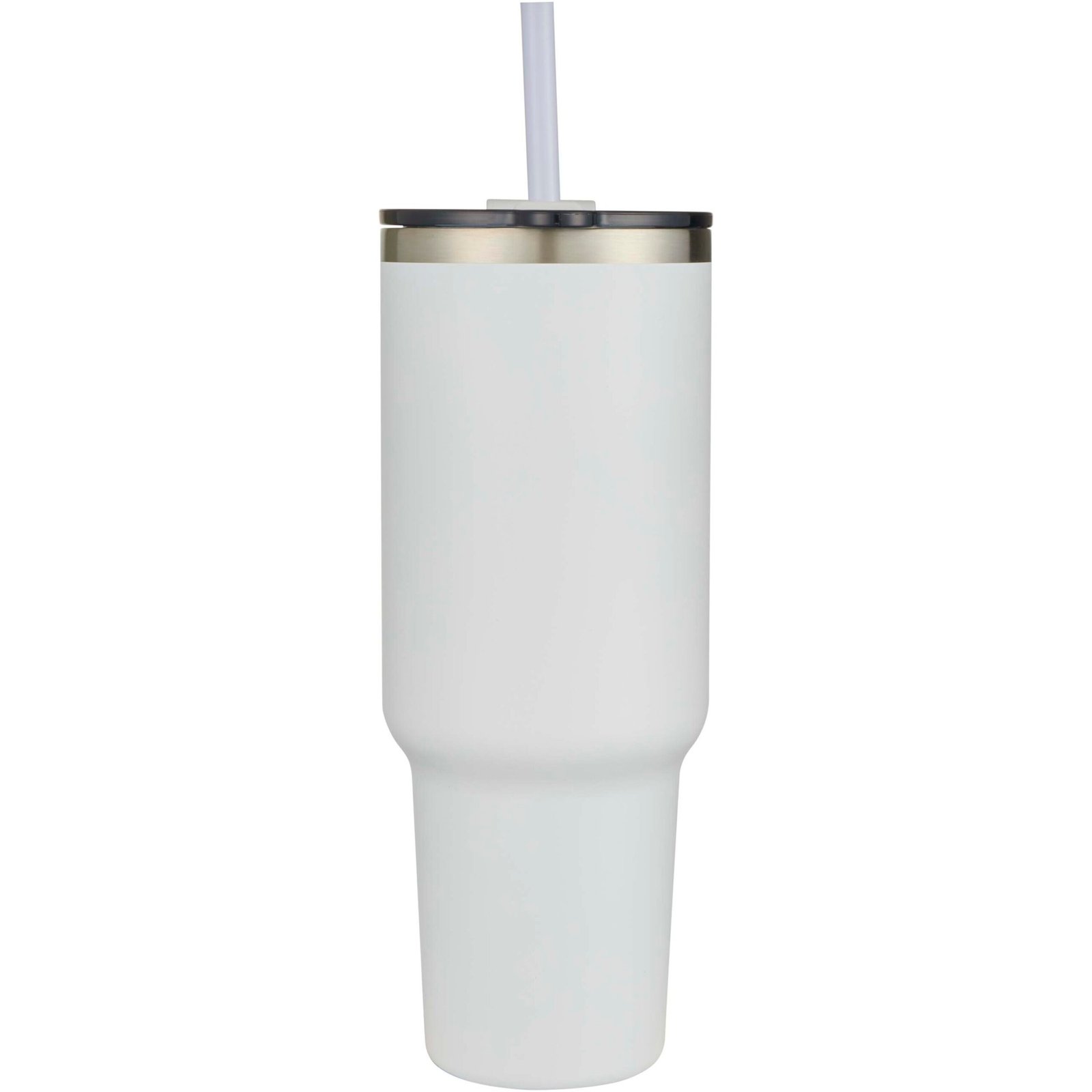 RCS certified double walled copper vacuum insulated tumbler, constructed using 91% post-consumer recycled stainless steel that will keep drinks cold for at least 24 hours, or hot for 9 hours. Features a Tritan straw, and a lid slider function to prevent spills. The 100% recycled plastic press-on swivel lid securely holds the straw in place, and can easily be rotated to expose the drink opening. Durable exterior powder coating. Volume capacity: 1200 ml. Hand wash only.