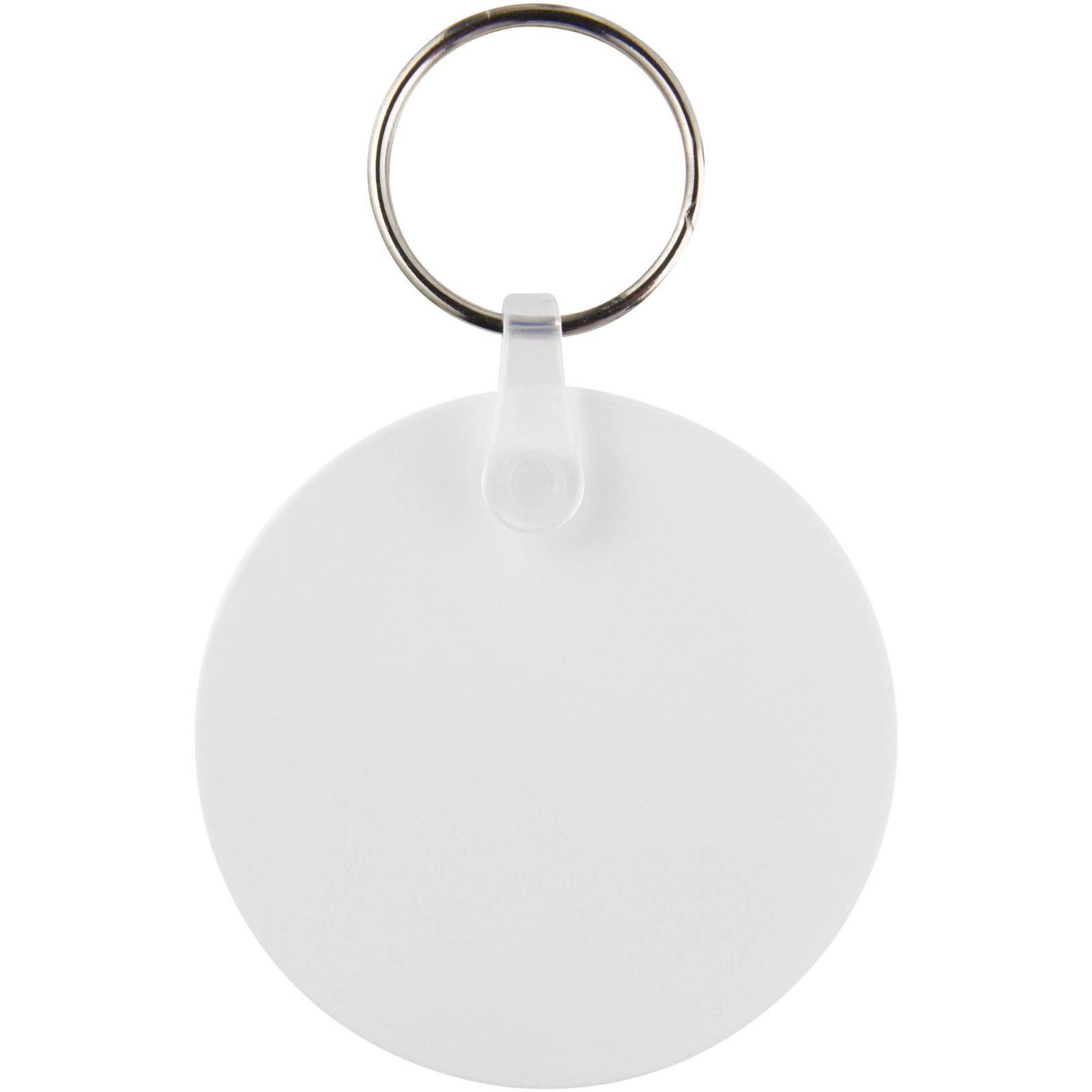 White circle-shaped keychain with metal split keyring. The metal looped ring offers a flat profile which is ideal for mailings.
