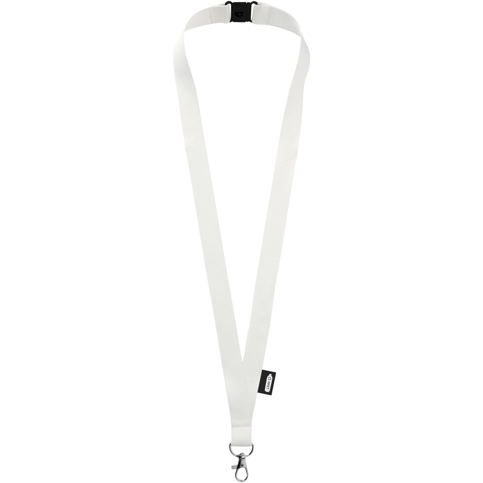 Recycled PET lanyard with breakaway closure. High quality oval hook with lobster clip that is ideal for holding a name badge, ID card, or keys.