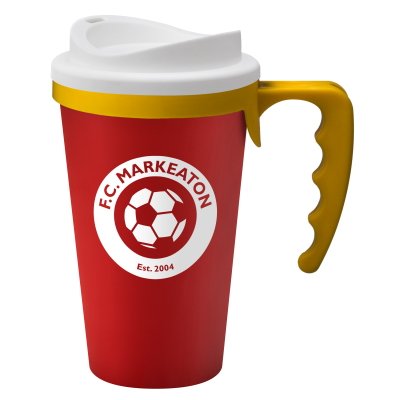 The bold red Universal Mug is a fantastically versatile product; insulated, made in the UK, top-rack dishwasher and microwave safe, BPA free and a great base for a logo. Body pantone:7626c