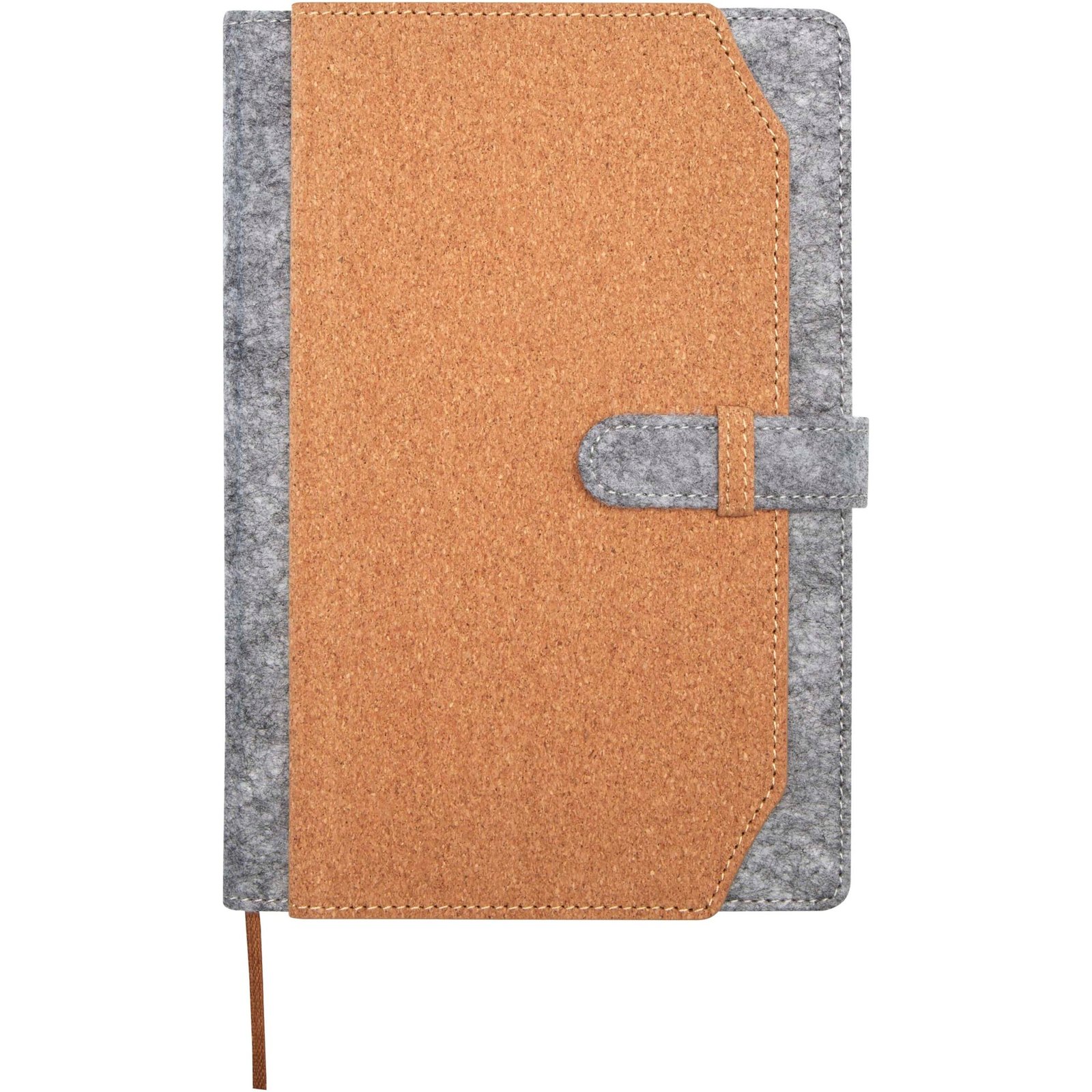 Hard cover A5 notebook made of recycled felt, and cork, with 80 lined sheets of 70 g/m² paper. The notebook includes 3 business card pockets, a matching brown ribbon, and rounded corners.