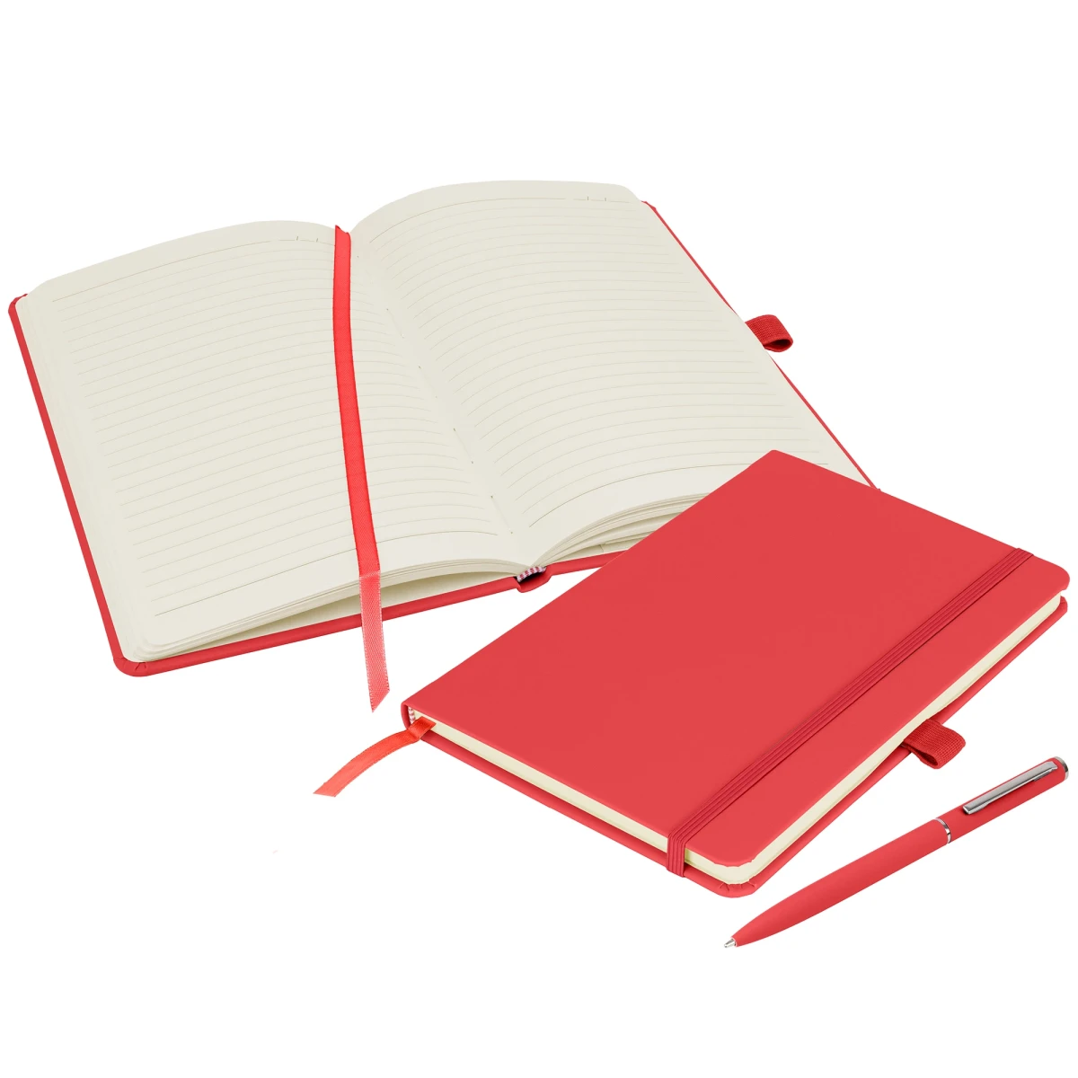 Deluxe eco-friendly A5 notebook offering high quality with its hardback, soft-feel PU cover and matching Wright ballpen in 30 colours. Supplied with a colour matched ribbon, pen loop and elastic closure. Contains 160 pages of 70gsm Ivory lined, sustainably-sourced FSC certified paper, with date marks and an inside back cover pocket.